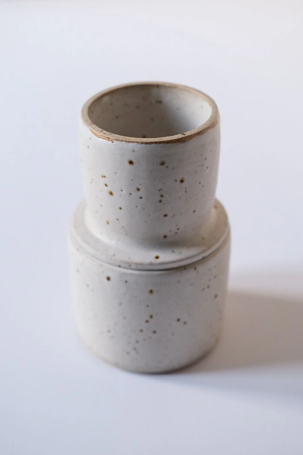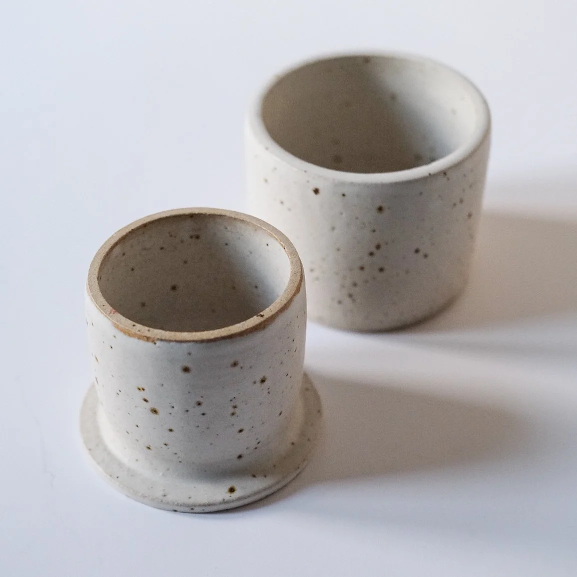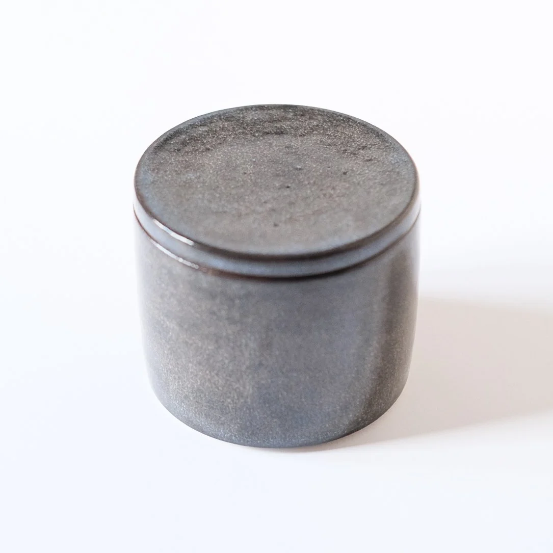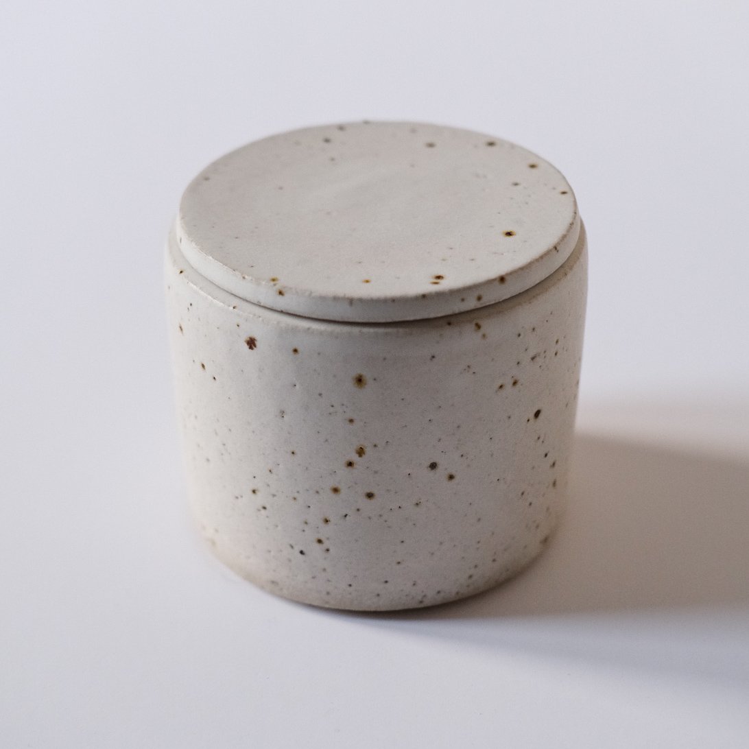 White matte glaze, on flecked stoneware clay showcasing the fleck of the clay. All measurements are approximate and given the handmade nature of the butter bell, some variations may exist from the item in the picture. Handwash is recommended.