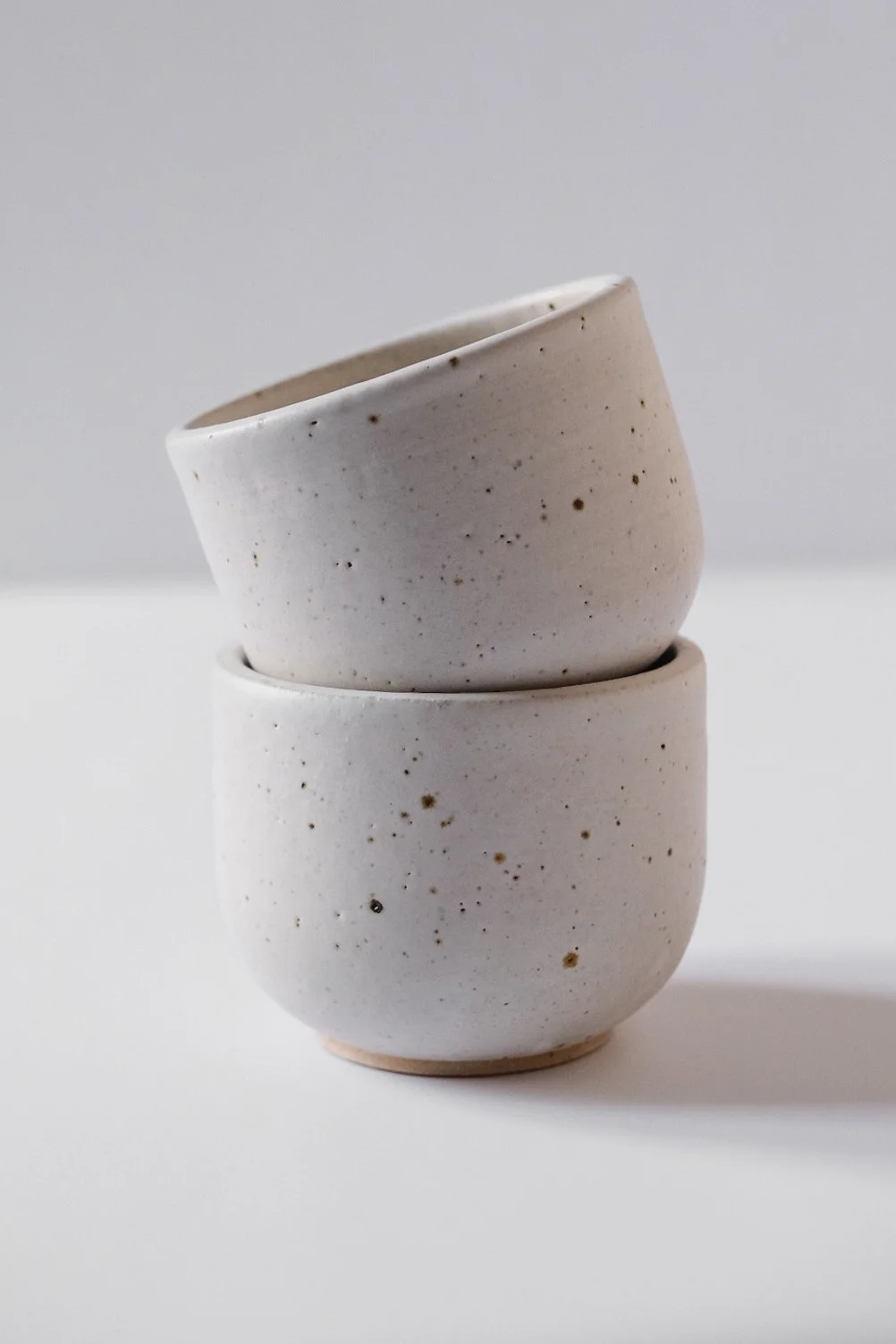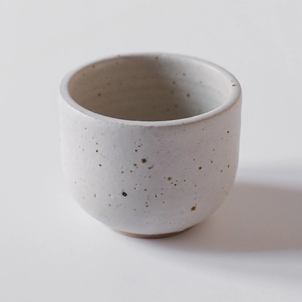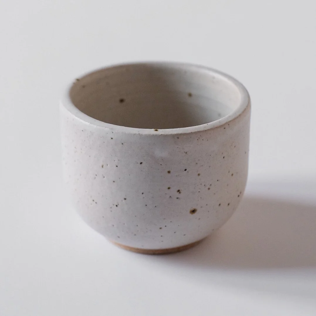 White matte glaze, on flecked stoneware clay showcasing the fleck of the clay. All measurements are approximate and given the handmade nature of the cup some variations may exist from the item in the picture. Handwash is recommended.