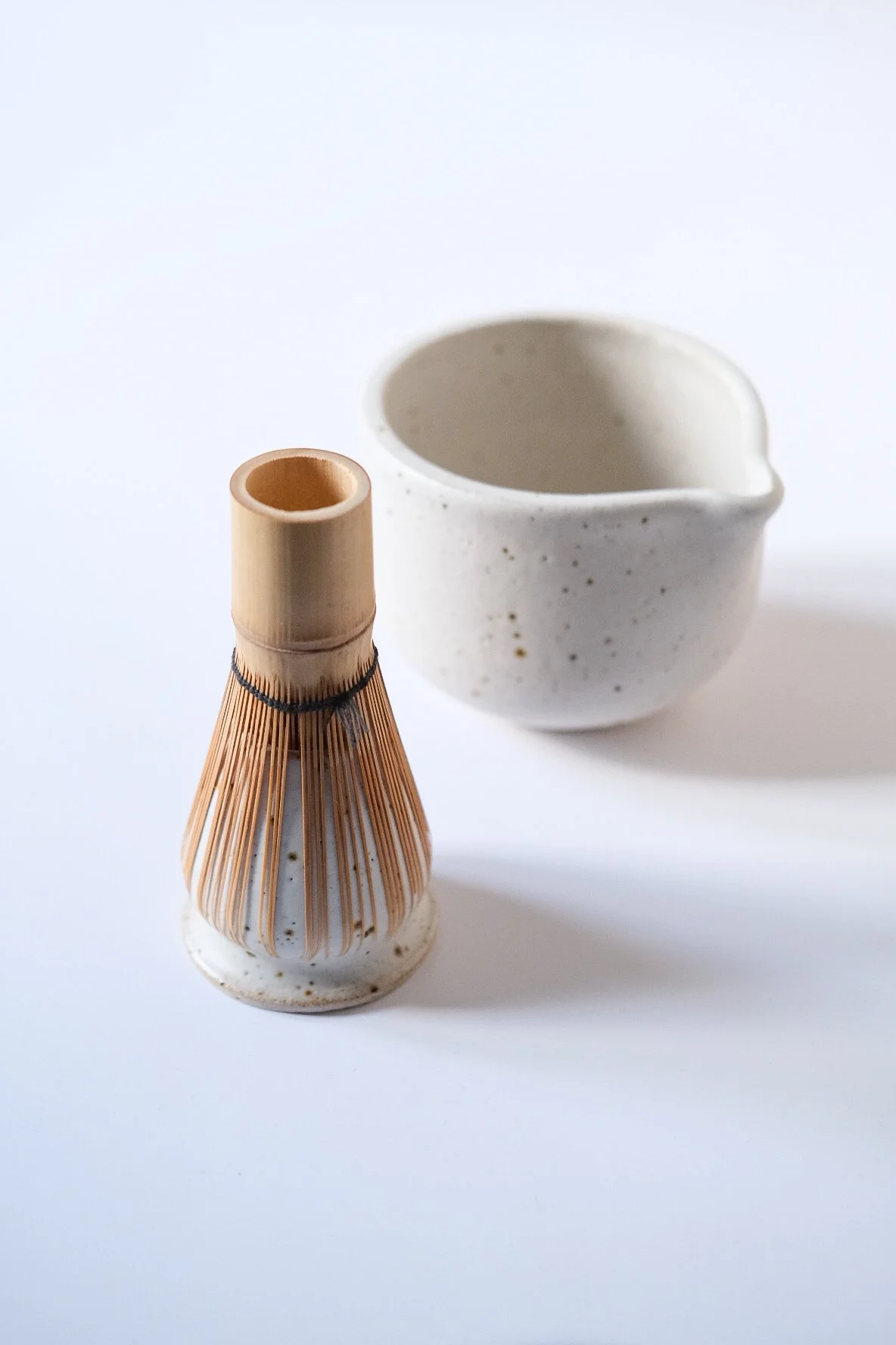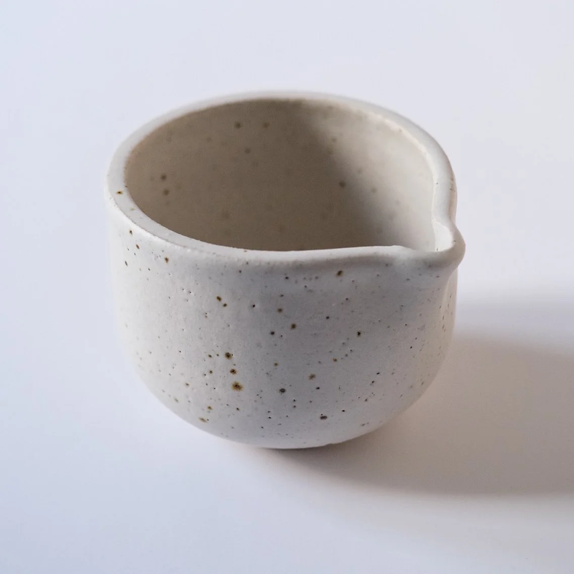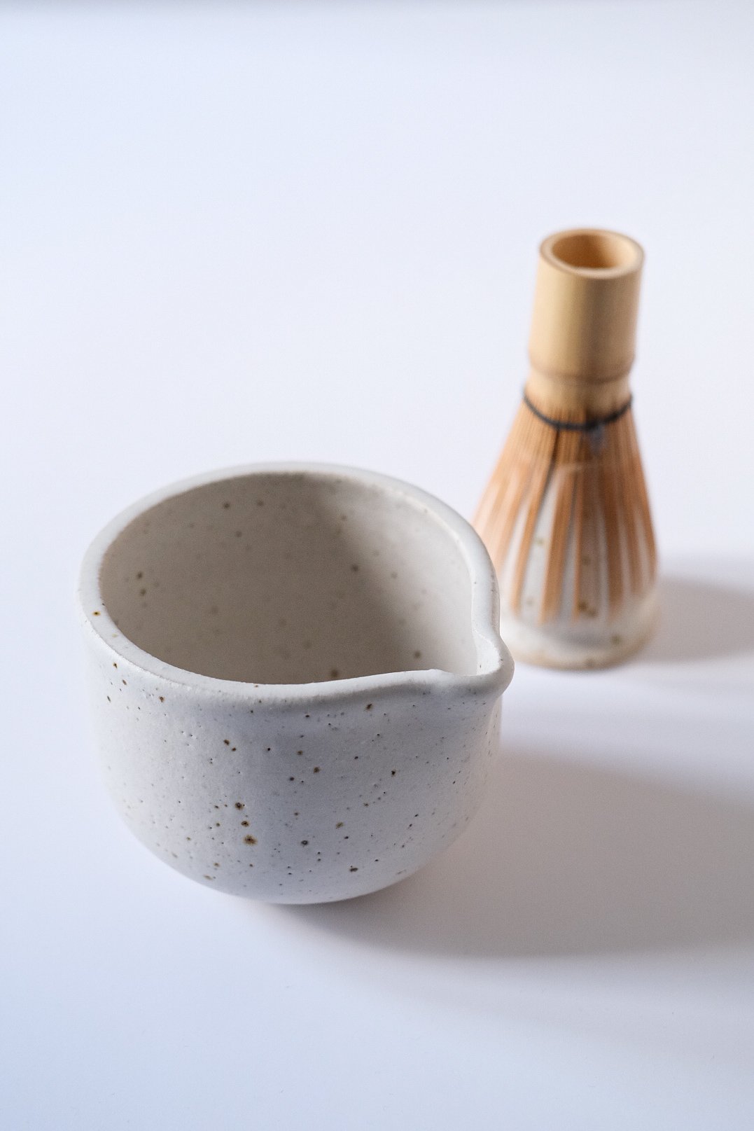 White matte glaze, on flecked stoneware clay showcasing the fleck of the clay. All measurements and volumes are approximate, and given the handmade nature of the matcha bowl, some variations may exist from the item in the picture. Handwash is recommended.
